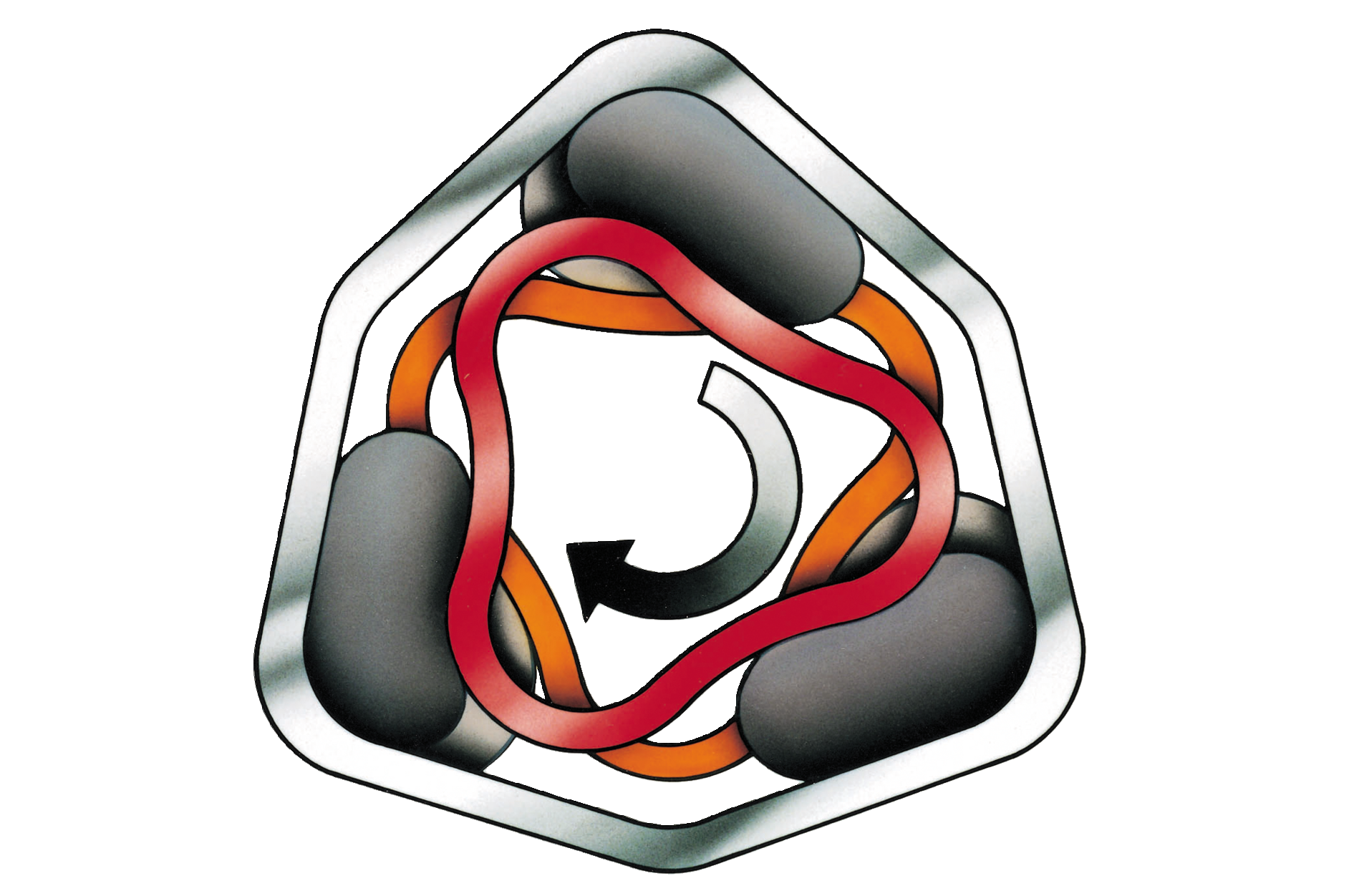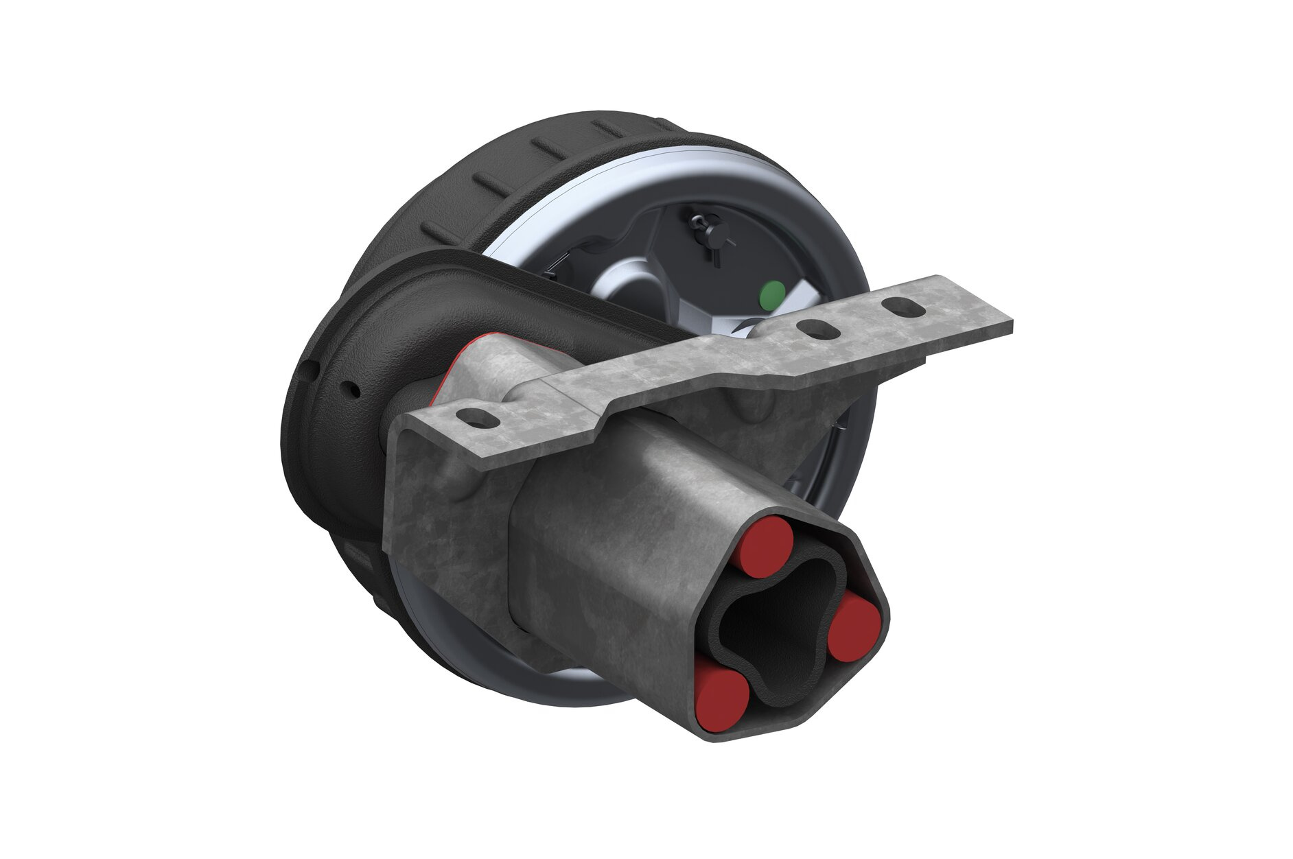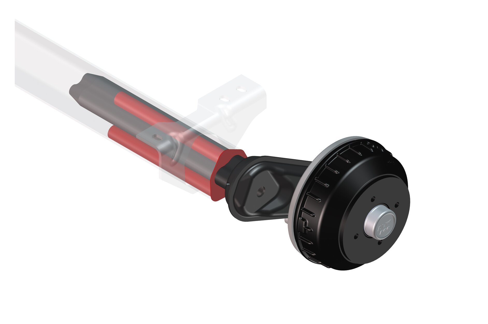 De rode/oranje koker betreft de zwenkarm die is vastgeklemd tussen in dit geval drie asrubbers. De buitenste zeskant is het ashuis, waarin de rubbers en zwenkarm zijn geperst. Door de verende eigenschappen van het rubber kan de zwenkarm in- en uitveren en komt hij (bij normale belasting) altijd weer in de beginpositie terug. Bron afbeelding: https://www.alko-tech.com/